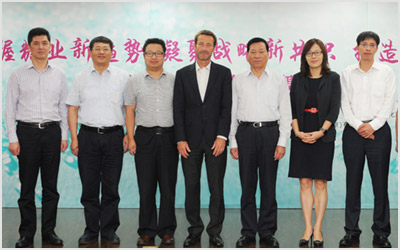 战略论坛主要领导及嘉宾合影,光明集团董事长吕永杰(右四),光明集团副总裁、上海糖酒董事长葛俊杰(左二),上海糖酒总裁崔智均(右一),心博在线手机版(大中国区)创始人孙彤(左三),路易达孚全球糖业总监Jacques Gillaux(左四)